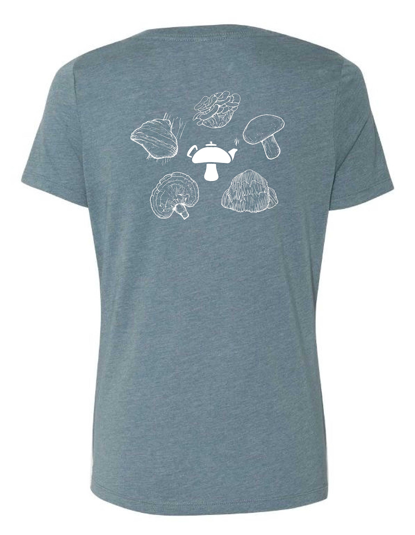 Front: A beautiful hand drawn design of someone offering you a tea cup blooming with wonderful functional mushrooms.